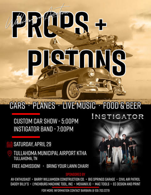• April 29, 2023 • Tullahoma Municipal Airport, Tullahoma, TN • Fly-In • Free Admission • Cars, Planes, Live Music, Food and Beer • Custom Car show at 5 PM • Instigator Band at 7 PM • For more information call 931-703-2279 WE HOPE TO SEE YOU THERE!